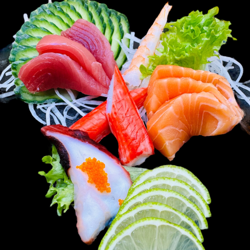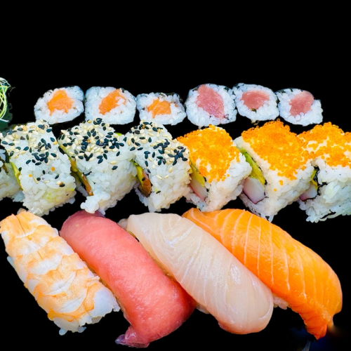 Serviert mit Salmon, King Fish, Tuna, Tamago, Ebi und Aal