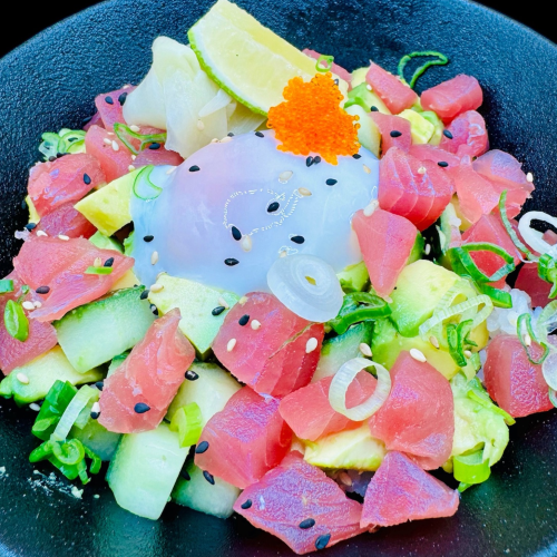 Mix Salmon, Tuna, Kingfish, gurke, Avocado und Onsen Eier