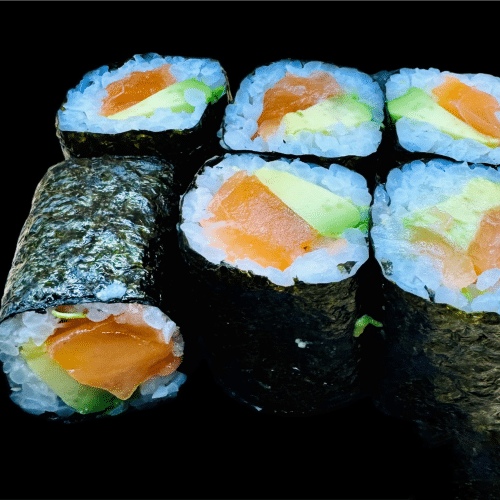 Tempura Cravetten und Avocado Rollen. Top mit Lachs spicy Tarta